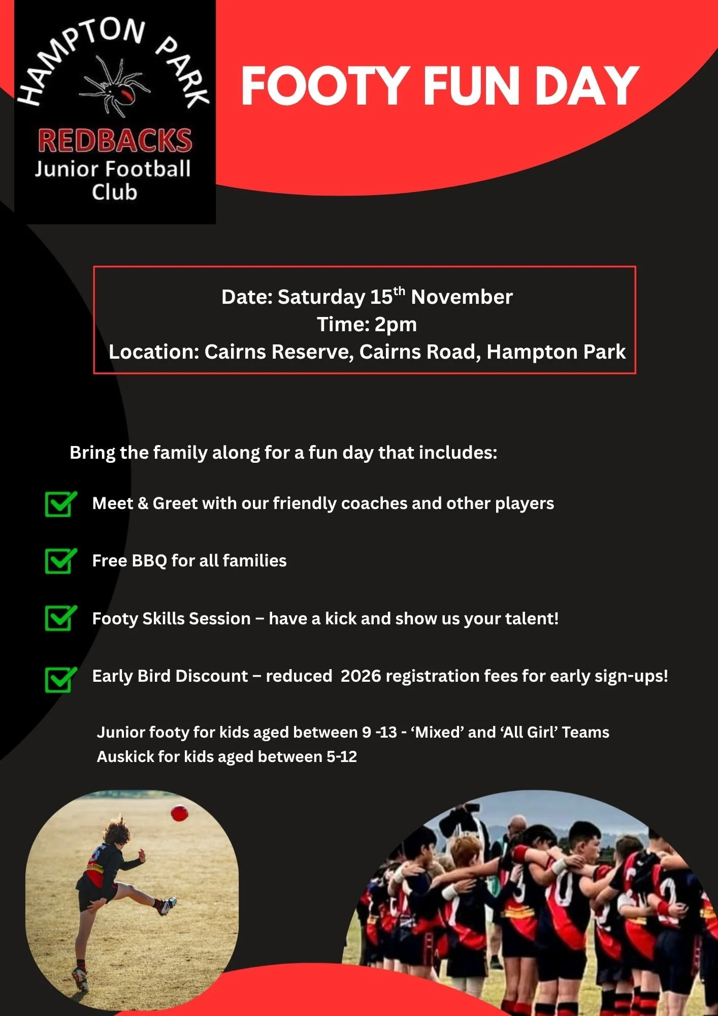 Hey Redbacks — Come down for a fun day of footy, free BBQ, and mates.